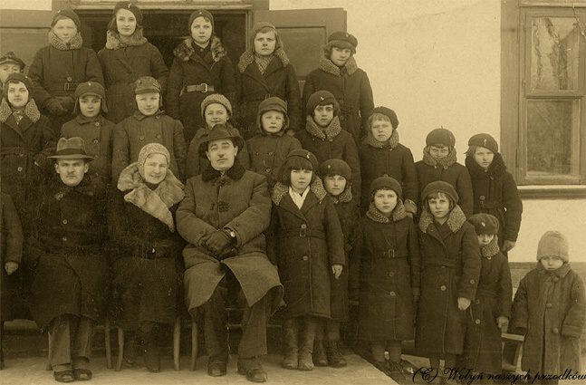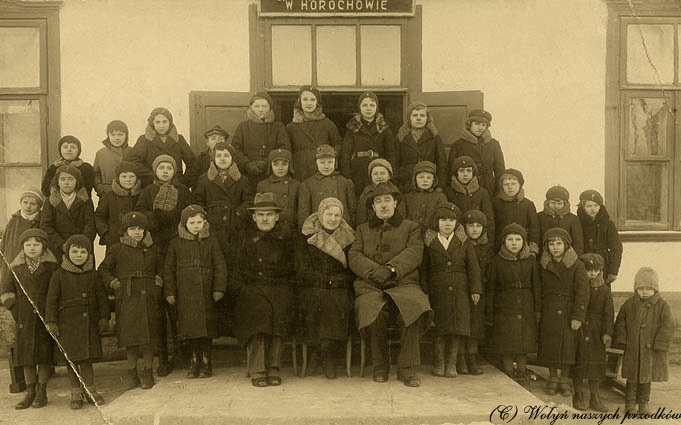Horochów, styczeń 1938 r. Pomoc zimowa dzieciom i młodzieży Szkoły Powszechnej. Dzieci otrzymały ciepłą odzież wierzchnią. Po środku siedzą: starosta powiatowy z żoną i kierownik szkoły. Ze zbiorów Janusza Korpaka.